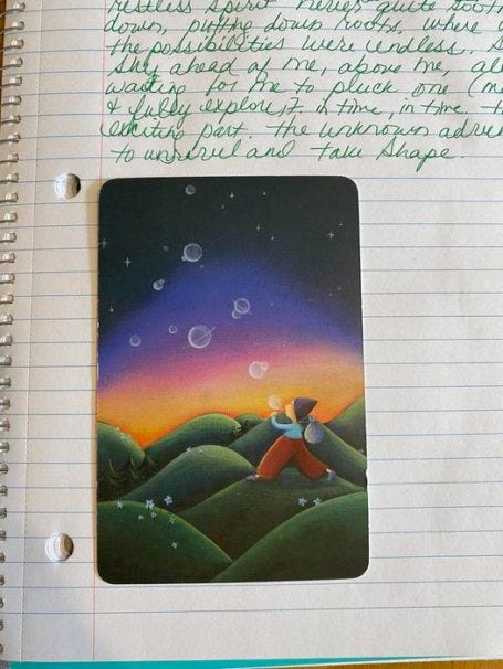 hi. i apologize that my studio notes didn’t go out last week. i ended up having surgery on my broken wrist last tuesday, and just wasn’t feeling up to it. i still haven’t returned to my desk & laptop, so this week i’m sharing a 6-minute freewrite i did on monday instead. the other group participants and i were instructed to choose from a pile of facedown cards. each card had only an illustrated image on it, no text. we were then told to turn our cards over and write about whatever came up for us. here is my image and my resulting passage: