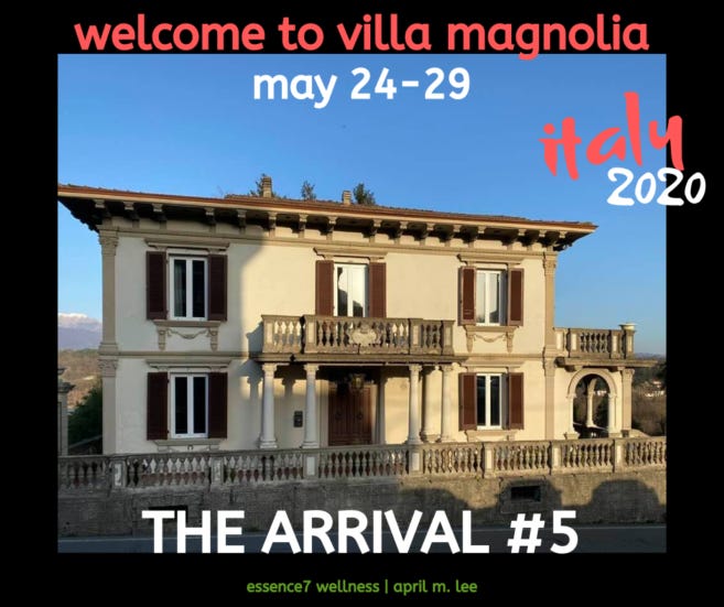 My essence7 philosophy continues to stretch and grow (just as I hope to always do) with each iteration. Don’t miss the chance to sign up now for this LIVE in-person guided tour to a more meaningful existence. A one-of-a-kind introspective excursion in Italy! Reserve your exclusive spot at Villa Magnolia NOW with one of the two payment methods offered. Once I receive your registration, you will receive a questionnaire with more detailed and pertinent information. If the retreat format, setting, and accommodations seem like the perfect fit and solution for you, we will move forward with your individualized payment plan. If not, I will refund your money. REFUND / CANCELLATION POLICY: Please note that because THE ARRIVAL retreat in Italy (operated through essence7 wellness LLC) is limited to a small number of attendees (allowing for a more personal and intimate experience), there is a refund/cancellation policy in effect: • FULL REFUND (whatever has been paid to date) up through February 29, 2020 – 12 calendar weeks or more before the retreat start date • PARTIAL REFUND (1/3 of total payment) between March 1 and April 18, 2020 – 6 calendar weeks before the retreat start date • NO REFUND on or after April 19, 2020
